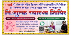 डॉक्टर मेनका और डॉक्टर राहुल सीनियर होम्योपैथिक फिजिशियन के तत्वावधान में दिनांक 8 मार्च को अंतर्राष्ट्रीय महिला दिवस पर ज्योति धाम अपार्टमेंट, लखनपुर, विकास नगर, कानपुर में स्थित मेरी क्लीनिक पर सुबह 9 बजे से शाम 5 बजे तक नि:शुल्क स्वास्थ्य शिविर का आयोजन किया गया था। शिविर का उद्घाटन करते हुए विधायक नीलिमा कटियार ने कार्यक्रम की सराहना करते हुए सभी के स्वस्थ और प्रसन्न रहने की कामना की। उन्होंने विशेष तौर पर डॉक्टर मेनका और डॉक्टर राहुल के उज्जवल भविष्य की कामना करते हुए बधाई दी। इस शिविर में लगभग दो सौ से अधिक मरीजों ने स्वास्थ्य संबंधित जानकारी एवं दवा ली।